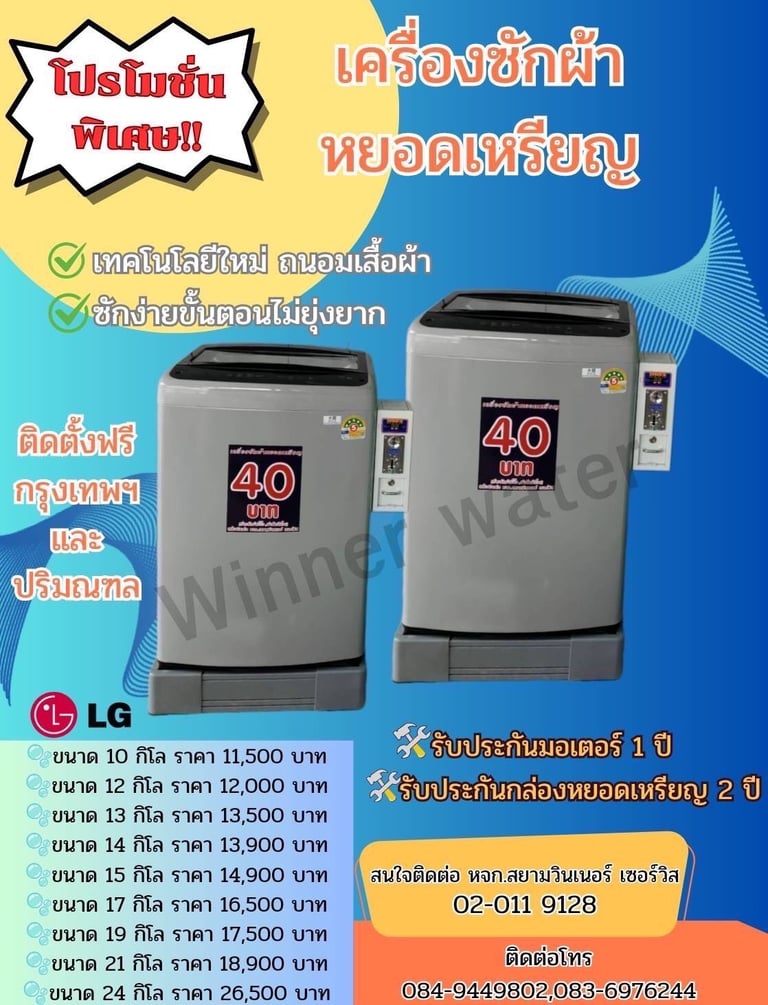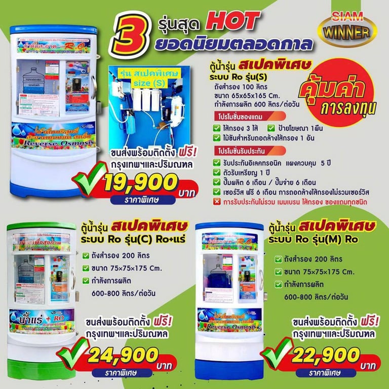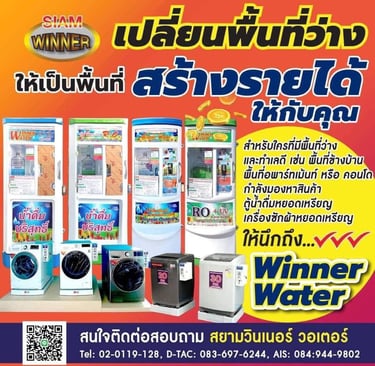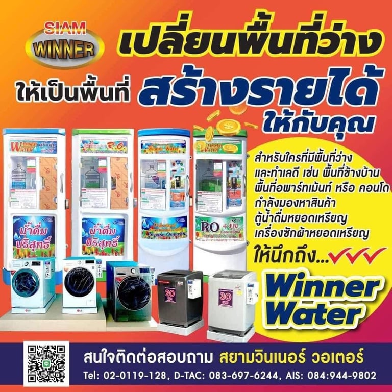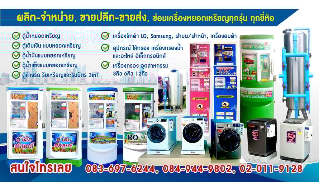 สยามวินเนอร์ ศูนย์บริการ จำหน่าย ติดตั้ง ซ่อม ตู้น้ำดื่มหยอดเหรียญ เครื่องซักผ้าหยอดเหรียญ ตู้เติมเงินออนไลน์ ตู้น้ำมันหยอดเหรียญ บริการอะไหล่ตู้น้ำ และ ซ่อมตู้น้ำหยอดเหรียญ ผลิตตู้น้ำดื่มหยอดเหรียญและให้บริการหลังการขาย ตรวจเช็คทุกขั้นตอน บริการรวดเร็ว เพื่อความคุ้มทุนของลูกค้า ด้วยทีมงานมืออาชีพพร้อมผู้เชี่ยวชาญประสบการณ์กว่า 10 ปี สินค้าดี มีคุณภาพ ราคาถูก พร้อมบริการหลังการขาย จากผู้ผลิตโดยตรง